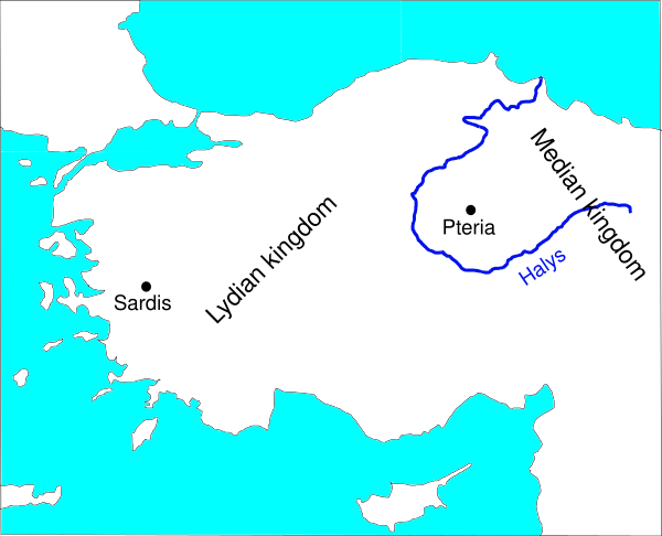 Лидийский царь Алиатт II (618—562 до н. э.), утвердив свою власть на левом берегу реки Галис, столкнулся с царём Мидии Киаксаром, имевшим притязание на Восточную Лидию. Война продолжалась шесть лет с переменным успехом.