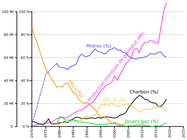 Процесс Мидрекс, наряду с HYL-III, также использующим в качестве восстановителя природный газ, получил наибольшее распространение среди технологий прямого восстановления железа, получивших общее название «бескоксовой металлургии»[6][7]. В условиях относительной дешевизны природного газа производство металлизованных окатышей на установках Мидрекс характеризуется лучшими экономическими показателями по сравнению с другими способами[8].
