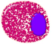 Ядро миелоцита довольно правильных округлых чертаний (не имеет почкообразных «вмятин») и выглядит «затерявшимся» среди многочисленных цитоплазматических гранул. Если ядро клетки имеет почкообразную «вмятину» или вдавленность, то это, скорее всего, уже не миелоцит, а следующая стадия развития — метамиелоцит.