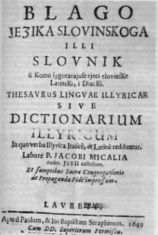 Это был первый хорватский словарь с хорватским (под названием «иллирийский» или «словинский») в качестве исходного языка (в том же словаре он рассматривает термины хорватский, словинский (Slovinian) и иллирийский как синонимы[15][16]). Важно, что в своём словаре Микаля называет хорватский язык «иллирийским» или «словинским», а итальянский — «латынью», который он называет «языком студентов» (diacki). Введение в словарь имеет «латинское» посвящение, примечание к читателю на итальянском языке (Al benigno lettore), изложение алфавита и орфографии на латыни и хорватском языке (Od ortographie jezika slovinskoga ili načina od pisanja) и итальянская грамматика на хорватском языке (Grammatika Talianska).