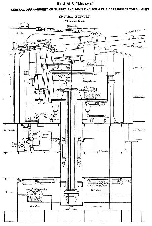 Главный калибр состоял из четырёх 305-мм орудий с длиной ствола 40 калибров (боекомплект 90 снарядов на ствол) с углом возвышения +13,5°. Они стреляли 386 кг снарядами с начальной скоростью в 732 м/с на 82 каб. Размещались в барбетах диаметром 10,7 м (на два фута меньше, чем у «Cикиcима»). Боекомплект состоял из бронебойных, фугасных и небольшого количества шрапнельных снарядов. Но если в Российском флоте главными считались бронебойные, то японцы, на результатах сражения при Ялу, сделали ставку на фугасные. Японские 12-дюймовые (30,5 см) снаряды ни разу не пробили российскую броню толщиной более 6 дюймов (152 мм) ни в одном из сражений Русско-японской войны[3].