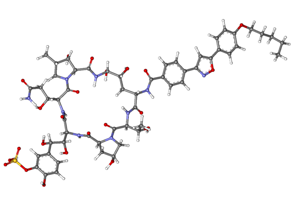 | ИЮПАК | {5-[(1S,2S)-2-[(3S,6S,9S,11R,15S,18S,20R,21R,24S,25S,26S)-3-[(1R)-2-carbamoyl-1-hydroxyethyl]-11,20,21,25-tetrahydroxy-15-[(1R)-1-hydroxyethyl]-26-methyl-2,5,8,14,17,23-hexaoxo-18-[(4-{5-[4-(pentyloxy)phenyl]-1,2-oxazol-3-yl}benzene)amido]-1,4,7,13,16,22-hexaazatricyclo[22.3.0.09,13]heptacosan-6-yl]-1,2-dihydroxyethyl]-2-hydroxyphenyl}oxidanesulfonic acid |