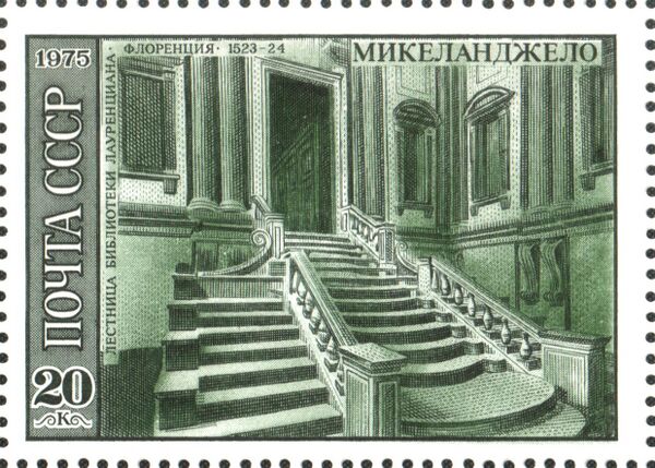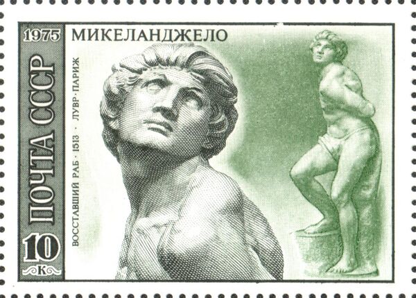 - В 1964 году Почта СССР выпустила марку: Деятели мировой культуры. Микеланджело (1475—1564), итальянский скульптор, художник, архитектор, поэт и мыслитель. Слева — скульптура умирающего раба на фоне Лауренцианской библиотеки во Флоренции. Справа — Микеланджело за работой над картоном росписи Сикстинской капеллы.