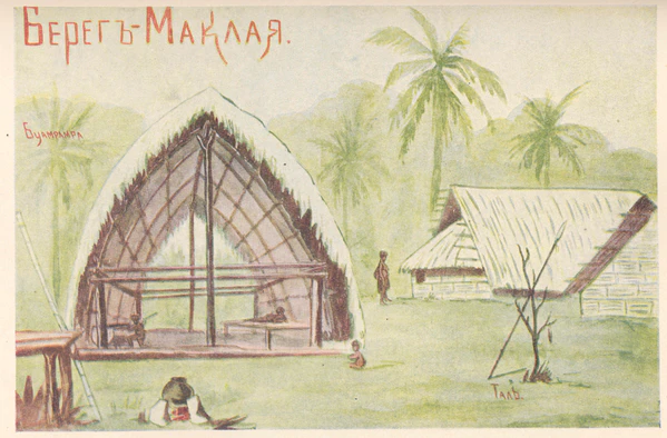 11 августа «Витязь» прибыл в Апиа, это был последний пункт, где Миклухо-Маклай мог снабдиться припасами и нанять слуг. Учёный встретился с предпринимателем Теодором Вебером, который заодно был германским консулом на Самоа. Открытое письмо немецкого правительства, предписывающее оказывать Николаю Николаевичу безвозмездные услуги, произвело впечатление. Вебер подыскал двух слуг: шведского матроса Ольсена (Миклухо-Маклай называл его «Ульсон») и юношу с острова Ниуэ по кличке Бой (англ. Boy)[133]. Не оставлял учёный и научных исследований, на Самоа особенно заинтересовавшись сексуальными обычаями местного населения[134]. Сделав по пути остановки на Ротуме и Новой Ирландии, 19 сентября 1871 года корабль достиг северо-восточного побережья Новой Гвинеи, войдя в Залив Астролябия (англ. Astrolabe Bay).