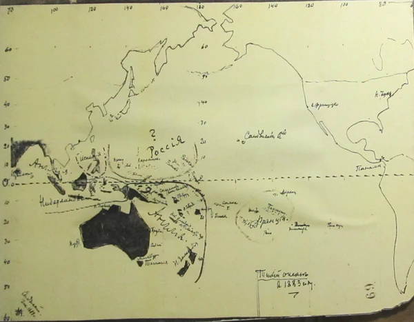 9 марта 1871 года плавание продолжилось, 1 апреля «Витязь» вошёл в Магелланов пролив. Через три дня они пришли в Пунта-Аренас. Хотя резкий переход от тропиков Бразилии к холодам Патагонии привёл к болезни Миклухо-Маклая, он усердно изучал и зарисовывал патагонцев[123]. 11 апреля «Витязь» продолжил путь и 16 апреля вышел в Тихий океан и направился на север вдоль побережья Чили[124]. В начале мая команда добралась в Вальпараисо, где Назимов простоял месяц, ожидая инструкций из Петербурга. Часть из них касалась Миклухо-Маклая, который просил, чтобы до высадки в Новой Гвинее корвет зашёл в Австралию. Для изучения индейцев учёный поехал в Талькауано, где приобрёл у начальника местной тюрьмы более 200 карточек арестантов с фотографиями и описанием преступлений: он считал, что сможет установить связь между характером и формой черепа. Эти материалы также до сих пор не обнаружены[125].