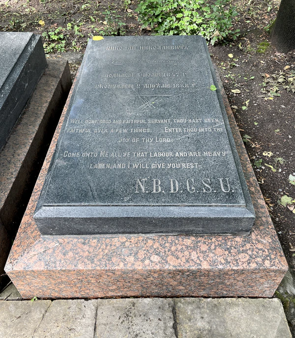 Из-за резкого похолодания выписку пришлось отменить, а 29 марта проявились симптомы сильнейшей простуды, которая перешла в бронхит и пневмонию. В 20 часов 15 минут 2 (14) апреля 1888 года Миклухо-Маклай скончался[284]. Вскрытие не проводилось по просьбе вдовы, отпевание состоялось в больничной церкви. К выносу тела подошли немногие, в том числе несколько членов РГО во главе с П. П. Семёновым, адмиралы П. Н. Назимов и Н. Н. Копытов. Больше людей пришло на Волковское кладбище, надгробную речь произнёс В. И. Модестов. Николая Николаевича похоронили справа от кладбищенской церкви, на Мухинских мостках, рядом с отцом и сестрой Ольгой (умершей родами в 1880 году). Надпись на плите из чёрного мрамора гласит: «Николай Николаевич Миклухо-Маклай родился 5-го июля 1847 года, скончался 2-го апреля 1888 года». Ниже приведены по-английски два евангельских текста: Мф. 25:21 и Мф. 11:28[285]. Маргарет велела выбить на плите аббревиатуру N.B.D.C.S.U. (Nothing But Death Can Separate Us)[286]. В 1938 году захоронения Николая Николаевича и его отца были перенесены на Литераторские мостки (Плитная дорожка)[287][288].