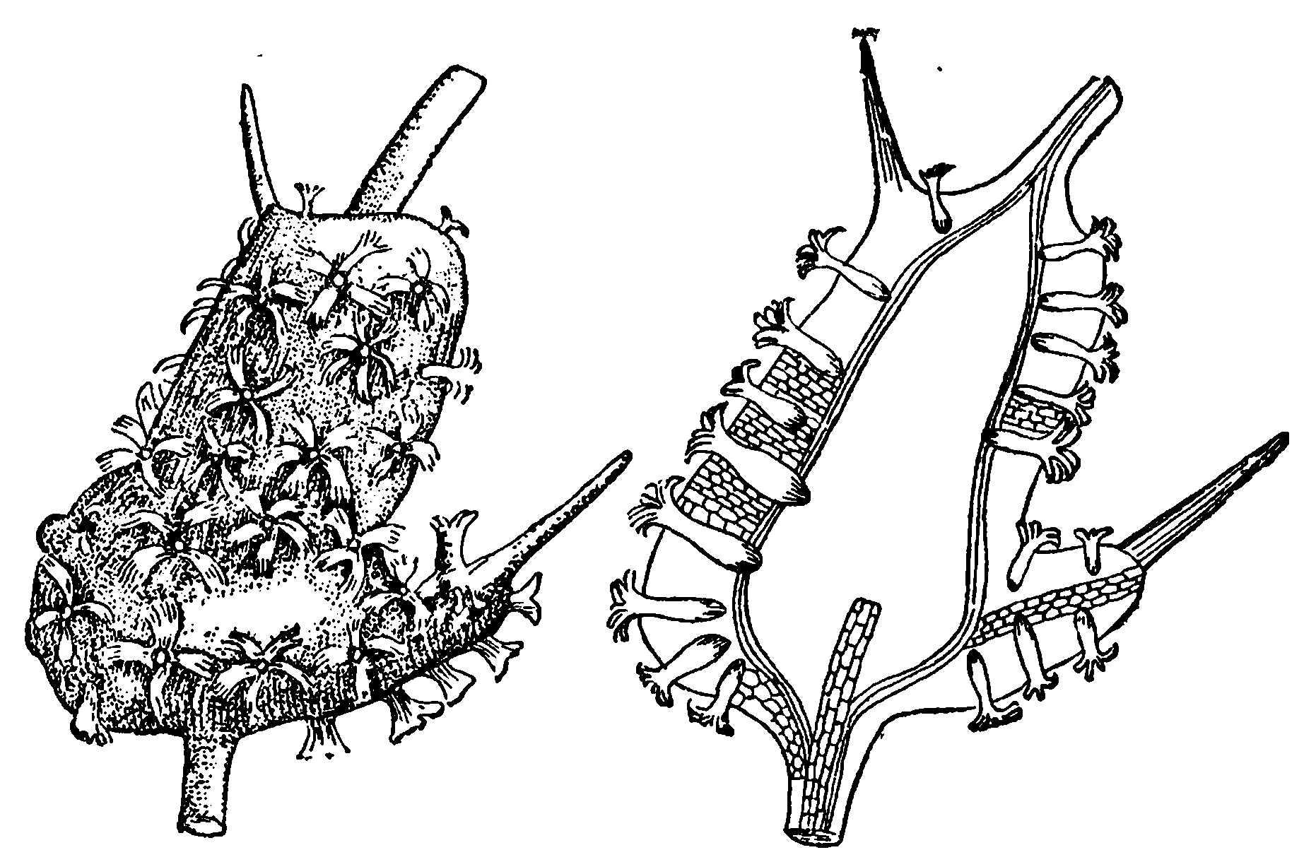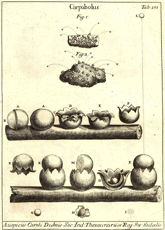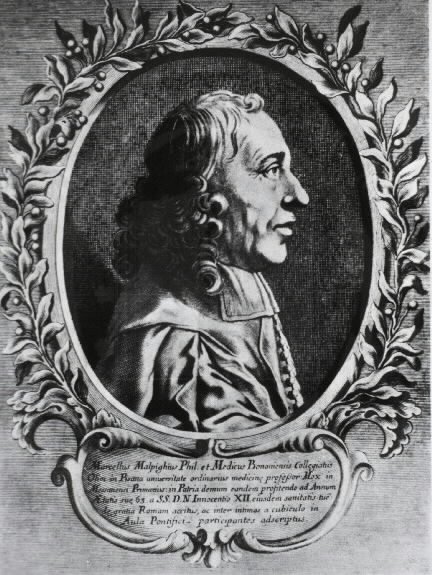 Слева направо: М. Мальпиги (1628—1694); Мальпиги, рисунок опухоли стебля боярышника (1675); рисунки из «Микрографии» Р. Гука — голубая плесень и ржавчина розы; сфероболусы, рис. П. А. Микели; П. А. Микели (1679—1737)