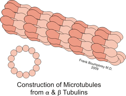 Микротрубочки — это структуры, в которых 13 протофиламентов[1], состоящих из гетеродимеров α- и β-тубулина, уложены по окружности полого цилиндра. Внешний диаметр цилиндра около 25 нм, внутренний — около 15.