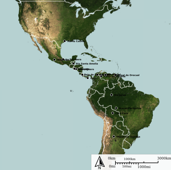 - Santa Amelia River, Эль-Петен (16° 12'51.05" с. ш. 89°59'59.03" з. д.) (Woodburne, 1969);