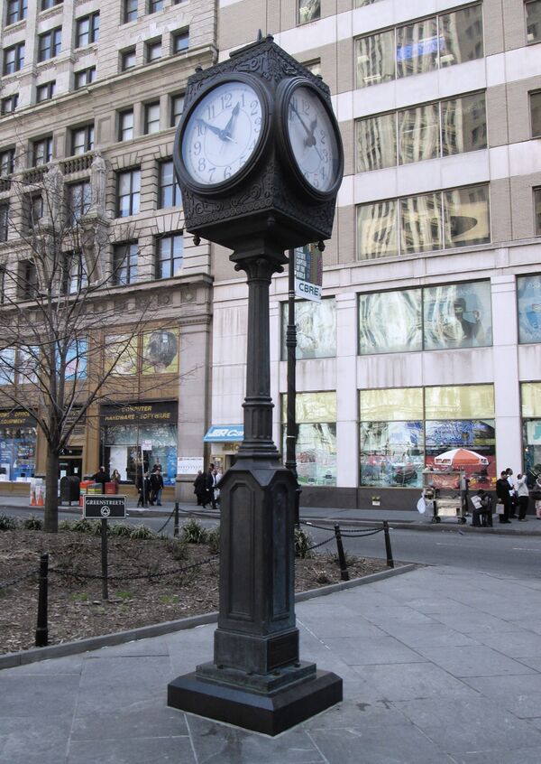 На южной оконечности площади находятся часы Дэвида Рокфеллера (англ. David Rockefeller Clock), названные в честь исполнительного директора Chase Manhattan Bank Дэвида Рокфеллера. [2] Младший внук Джона Д. Рокфеллера сыграл важную роль в поддержании жизнеспособности этой части Манхэттена в то время, когда многие организации переезжали из центра на окраины и в пригороды. В частности, он содействовал сохранению Саут-Стрит-Сипорт, а также строительству Всемирного торгового центра и Бэттери-Парк-Сити. Часы весом 3500 фунтов были спроектированы в стиле конца XIX века, чтобы гармонично сочетаться с фонтаном и светильниками викторианского периода, находящимся в парке Сити-Холл.