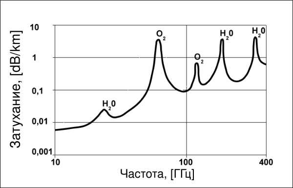 Достоинством диапазона миллиметровых волн являются малые размеры антенн[2] (что позволяет уменьшить габаритные размеры радиосистемы в целом) и бо́льшая абсолютная полоса частот (что обеспечивает возможность совместного использования диапазона бо́льшим числом радиосистем). Однако, по сравнению с более низкочастотными диапазонами, радиоволны миллиметрового диапазона испытывают сильное затухание при распространении в земной атмосфере. Затухание вызвано резонансным поглощением энергии волн в атмосферных газах (преимущественно, в молекулах воды и кислорода, см. врезку; в частности, сильное поглощение в полосе 57—64 ГГц обусловлено взаимодействием с молекулами кислорода), а также в гидрометеорах (дождь, туман, снег и др.). Вследствие этого земные радиосистемы миллиметрового диапазона характеризуются малой дальностью действия (от десятков километров до нескольких сотен метров) и сильной зависимостью от погодных условий.
