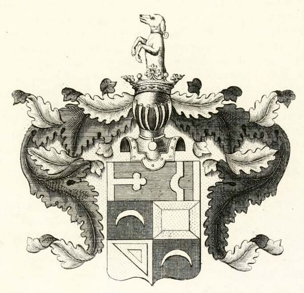 Описание герба: Выписка из Гербовника Щит имеет две части — верхнюю малую и нижнюю пространную; в первой изображает в голубом поле золотой замок и ключ крепостных ворот. В нижней части в верхнем правом и нижнем левом чёрном поле видно по одной серебряной луне, рогами обращённой вниз, а в верхнем левом и нижнем правом золотом поле означены части крепости. Щит увенчан обыкновенным дворянским шлемом с дворянской на нём короной, на поверхности которой находится выходящая до половины собака в золотом ошейнике. Намёт на щите голубого и чёрного цвета, подложенный золотом. |
