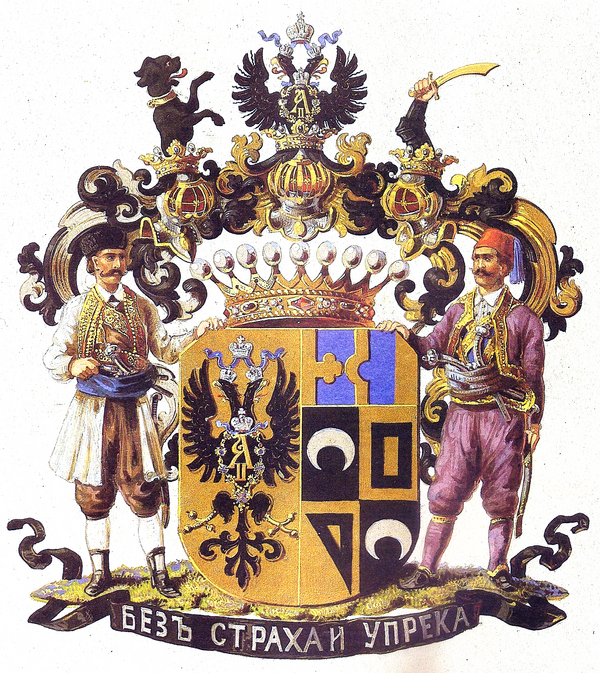 Намёты: средний — чёрный с золотом, правый — чёрный с серебром и левый — чёрный с золотом. Щитодержатели: два серба. Девиз: «БЕЗ СТРАХА И УПРЁКА» серебряными буквами на чёрной ленте[3].