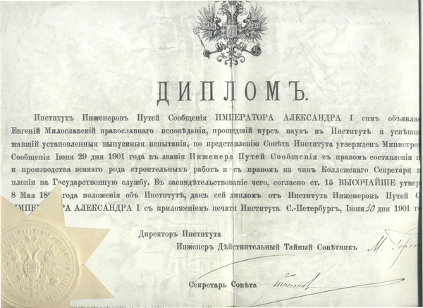 Родился в семье купца. В 1901 году окончил Санкт-Петербургский Институт инженеров путей сообщения императора Александра I. Коллежский секретарь. В 1901—1922 года занимал разные руководящие должности на железнодорожном транспорте; в 1901 −07 гг. Милославский Е. И. инженер Правления, Московско-Виндаво-Рыбинская железная дорога (г. Санкт-Петербург), в 1907-13 гг. начальник 13 пути и участка железной дороги, Московско-Виндаво-Рыбинская железная дорога (г Бежецк, Рыбинск), в 1913-15 гг. — преподаватель курсов по эксплуатации Управления Московско-Виндаво-Рыбинской железной дороги (г. Рыбинск).