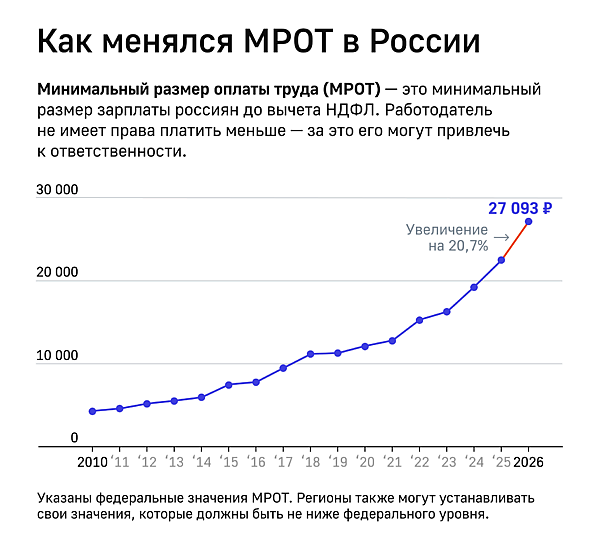 С 1 января 2026 года МРОТ составит 27 093 рубля[29][30].