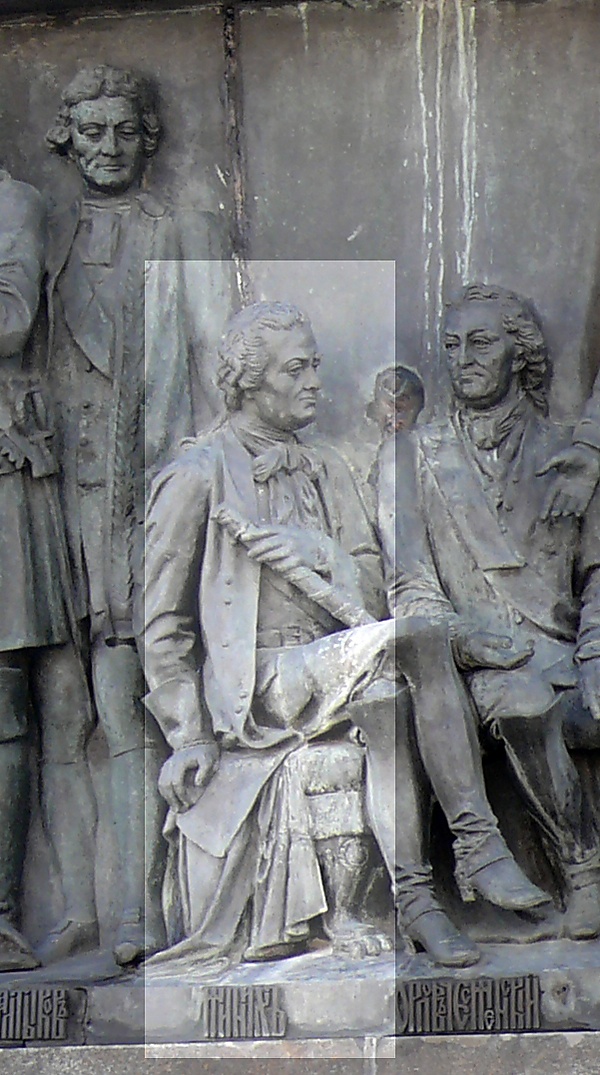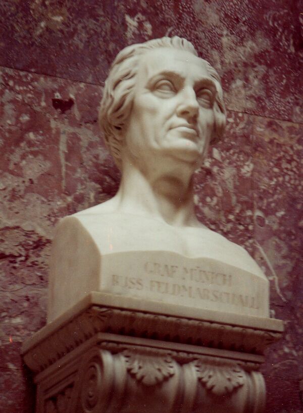 - Фигура Миниха на памятнике «Тысячелетие России» в Великом Новгороде (в группе «Военные люди и герои», сидит в профиль чуть правее центра группы)