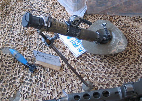 - Схема «с унитарным стволом». Конструктивно наиболее простая, она представляет собой фактически просто ствол с закреплёнными на его казённой части сошником либо (чаще) малоразмерной опорной плитой (называемой также «пятой»). Упирая такое оружие в грунт, стрелок-наводчик рукой придаёт ему нужный угол возвышения. Эта схема обычно применяется для лёгких малокалиберных (37-60 мм) миномётов, состоящих на вооружении отделений и взводов[118][119]. Иногда используется и промежуточное между схемами (3) и (5) решение: миномёт, выполненный в целом по схеме унитарного ствола, комплектуется, тем не менее, дополнительным съёмным стержнем-опорой, заменяющим классическую двуногу[120].