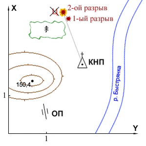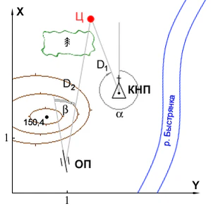 На Рис. 1 приведена схематизированная топографическая карта местности, иллюстрирующая такую ситуацию: цель Ц (миномётная батарея противника) загорожена от прямого наблюдения с огневой позиции склоном высоты 150,4 и хвойным лесом, поэтому наблюдение ведётся с КНП на равнинном участке, откуда хорошо видна цель. С помощью буссоли и дальномера определяются дальность D1 = 1500 м и дирекционный угол α ≈ 56-56.