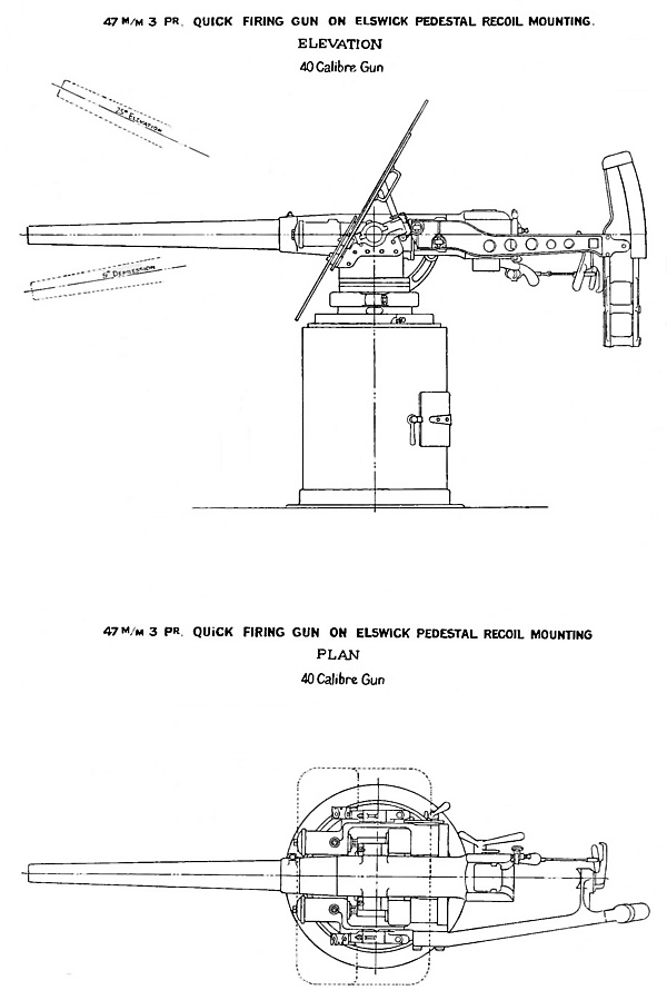 Появление миноносцев способствовало появлению в начале 1880-х годов на крупных кораблях противоминной артиллерии: 37-мм револьверных пушек «Гочкиса» с системой из пяти стволов (позднее — 47-мм пушек Гочкиса)[17]) и 25-мм четырёхствольных пушек-митральез Норденфельда[18]. Совершенствование миноносцев и торпед способствовало и увеличению скорострельности корабельных орудий среднего калибра (102-мм).