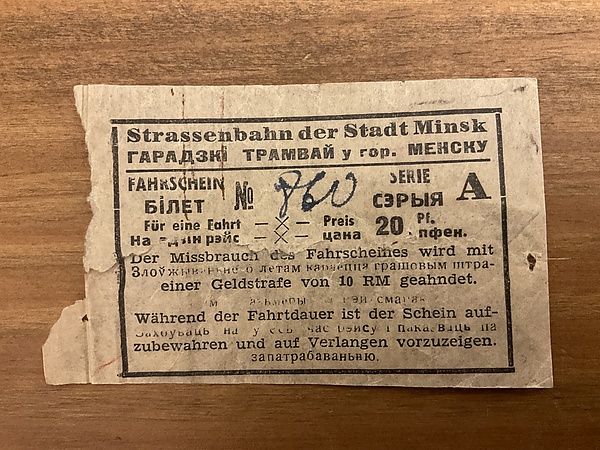 Билет на трамвай города Минск 1943 / 1944 годов: