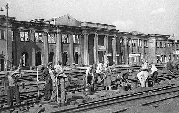 С началом Великой Отечественной войны основное здание вокзала уцелело, о чём свидетельствуют любительские фото сделанные немецко-фашистскими захватчиками[4] и использовалось ими по прямому назначению, однако, было существенно повреждено во время освобождения Минска от гитлеровской оккупации летом 1944 года и вокзал пришлось восстанавливать[5]. Реконструкция закончилось в 1946 году, здание просуществовало до сентября 1991-го, когда оно было демонтировано. От сталинского вокзального комплекса осталось лишь здание пригородного вокзала построенное в 1955 году, переоборудованное ныне для размещения международных касс.