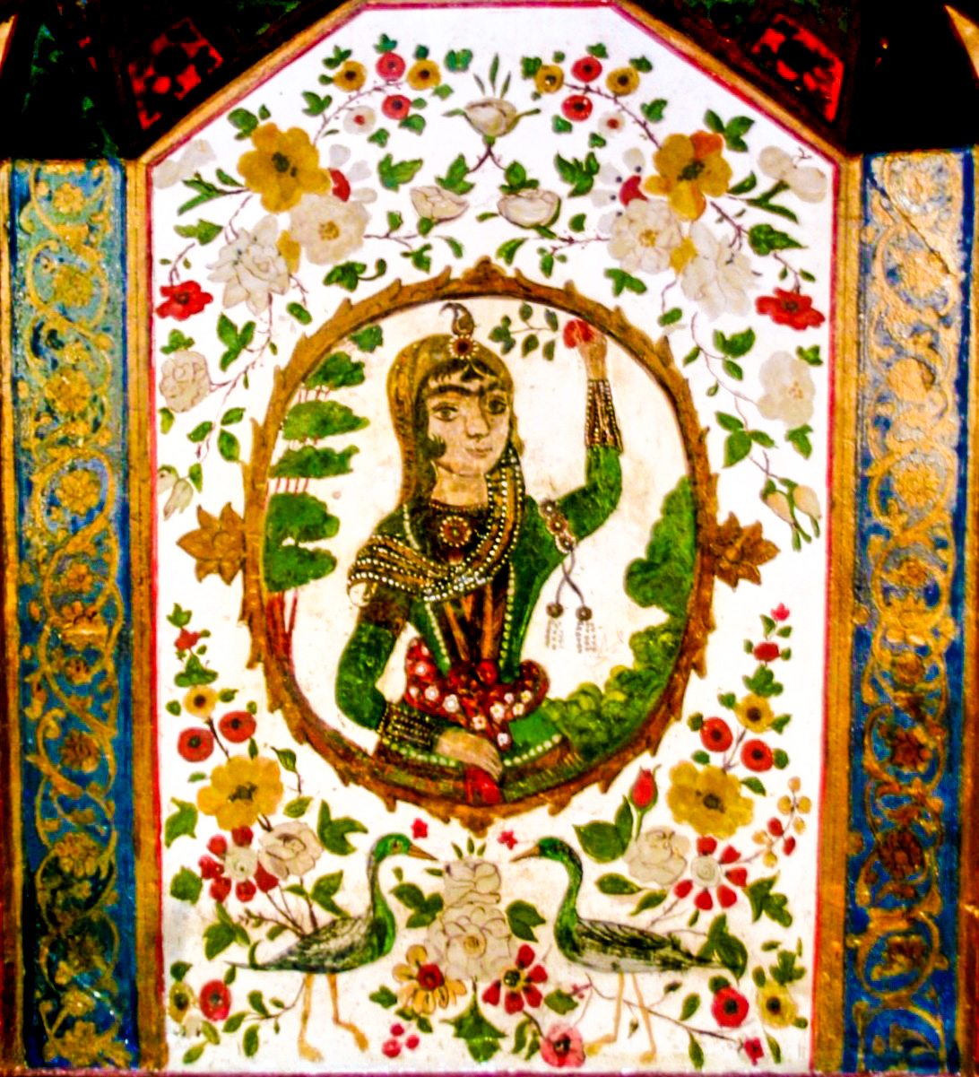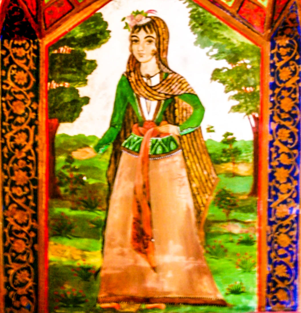 Женские портреты на темы поэм классика персидской поэзии Низами Гянджеви[11][27] (справа Ширин из «Хосров и Ширин»)[28] в интерьере Дома Шекихановых в Шеки. По словам искусствоведа Натальи Миклашевской, с одеяниями женских персонажей в росписях этого дома схожи шляпка и покрой платья «Танцовщицы» Эривани