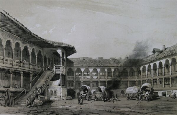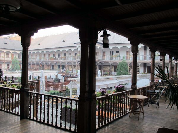 В 1806 году, после начала Русско-турецкой войны 1806—1812 г.г., достигнув Бухареста, Манук-бей поселился в своём дворце. Во второй половине того же года он начал строительство гостиницы, которое было завершено в 1808 году. В то время архитектура была довольно инновационной, так как Манук-бей хотел, чтобы его гостиница не выглядела, как крепость восемнадцатого века. К концу восемнадцатого века эта земля принадлежала господарскому суду. Манук-бей (один из богатейших людей того времени) приобрёл и другие имения в Валахии.