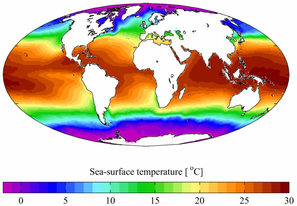 Вода обладает огромной теплоёмкостью, поэтому температура океана меняется гораздо медленнее, чем температура воздуха или суши. Близкие к океану районы имеют меньшие суточные и сезонные колебания температуры.