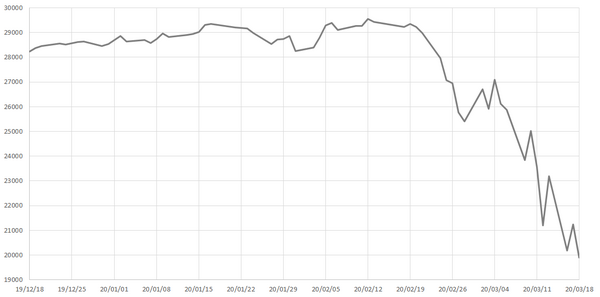 Дальнейшее развитие событий привело к глобальному обвалу фондового рынка, который начался 20 февраля 2020 года.[54][55][56] Промышленный индекс Доу Джонса, индекс S&P 500 и NASDAQ-100 упали 27 февраля в одну из худших торговых недель после финансового кризиса 2007—2008 годов.[57][58] Рынки в течение следующей недели стали чрезвычайно волатильными, с колебаниями в 3 % или более за ежедневную сессию.[59][60] 9 марта все три индекса Уолл-стрит упали более чем на 7 % на фоне снижения деловой активности в большинстве стран.[61][62] Падение получило название Чёрный понедельник, и было худшим падением со времён мирового кризиса в 2008–2009 годах.[63][64] Через три дня после Чёрного понедельника произошло ещё одно падение — Чёрный четверг, когда акции по всей Европе и Северной Америке упали более чем на 9 %. На Уолл-стрит произошло самое большое однодневное снижение процентных ставок со времён Чёрного понедельника в 1987 году, а индекс FTSE Mors of Borsa Italiana упал более чем на 17 %, став самым пострадавшим рынком во время Чёрного четверга.[65][66][67]