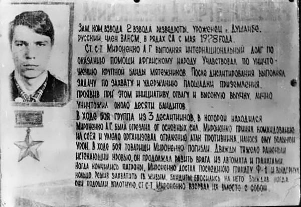 Александр Григорьевич Мироненко (20 октября 1959 — 29 февраля 1980) — заместитель командира взвода разведывательной роты 317-го гвардейского парашютно-десантного полка 103-й гвардейской воздушно-десантной дивизии в составе 40-й армии Туркестанского военного округа (ОКСВА), гвардии старший сержант. Героически погиб в ходе Кунарской войсковой операции советских войск в Афганистане, вступив в неравный бой с моджахедами. Один из первых кавалеров звезды Героя Советского Союза в Афганской войне.