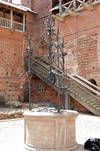 - По другой легенде, во время постройки замка во время рытья котлована были найдены кости мамонта. Но не знали кому они принадлежат, и решили, что это кости великана и навесили их на цеп ворот въездной башни[134]. Народная фантазия превратила настоящие кости живого существа в легендарных великанов-строителей Мирского замка[206].