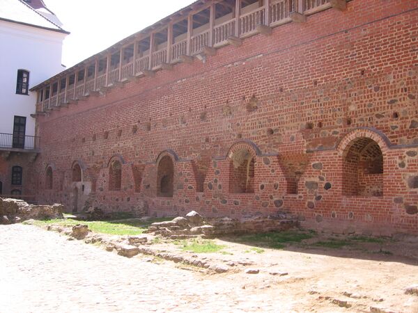 На протяжении первого периода строительства возведение Мирского замка не было завершено. Недостроенными оставались верхние ярусы северо-западной башни, замковые стены[32], а также капитальные постройки в южной и западной частях замкового двора, которые могли быть предназначены для жилья гарнизона и челяди. Согласно старой традиции, под жильё феодала отводилась одна из башен, скорее всего юго-западная. Об этом свидетельствует оригинальный декор башни: в нишах на её фасадах выявлены декоративные многоцветные композиции, так называемые «оказийные» росписи, которые могли быть созданы в честь получения в 1555 году последним владельцем из рода Илиничей титула графа Священной Римской империи[33].