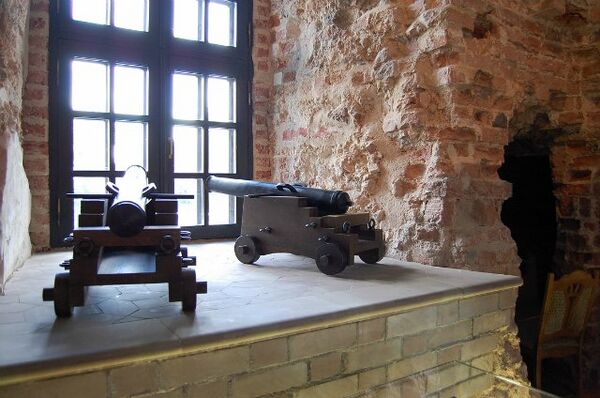 Квадратный план башен и размещение их за внешней линией стен создавали возможность вести обстрел врага не только прямо, но и вдоль стен. По тем временам это была самая прогрессивная система обороны и только несовершенство огнестрельного оружия заставляло ещё использовать традиционные способы ведения обороны с помощью луков, арбалетов, камней, смолы и вара[26].