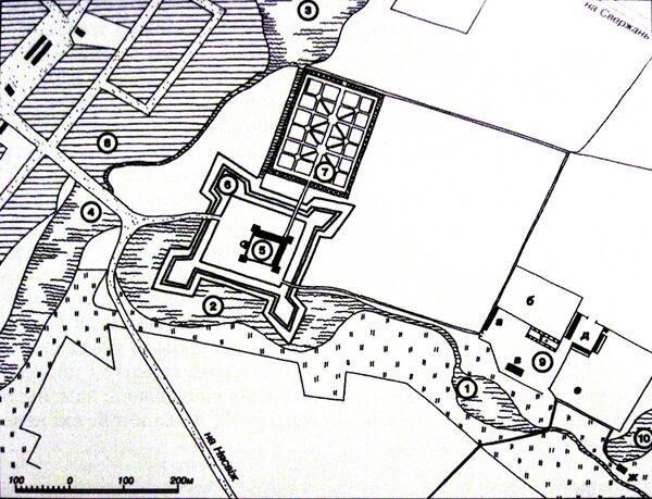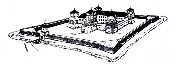 Поскольку старые стены перестали быть непреодолимой преградой для более совершенной артиллерии, то основную оборонительную функцию стали выполнять земляные валы с бастионами по углам так называемого голландского типа[50], прорезанные рвами с водой[51]. Высота вала достигала 9 метров и по его углам размещались оборонительные бастионы. Эффективность земляных укреплений дополнялась искусственно созданной системе обводнения. Вал обрамлял ров, наполненный водой благодаря Замковому рву и реке Миранке[52], что позволяло создать каскад прудов с водяным мельницами на плотинах. Наличие водной глади обогатило пейзаж художественной композицией с выразительным отражением замка в воде[38].