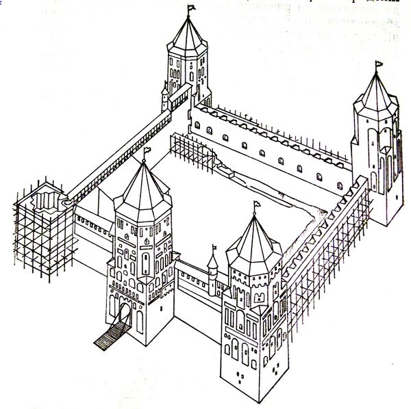 В башне над воротами на втором ярусе разместилась часовня св. Христофора, а на третьем были установлены часы. Из часовни пробили выход прямо к княжеским покоям на север и боевым галереям на юг. На недостроенной южной стене была построена новая боевая галерея, а также была переделана старая западная[45]. Вся постройка в целом фактически превратилась в дворец[49].