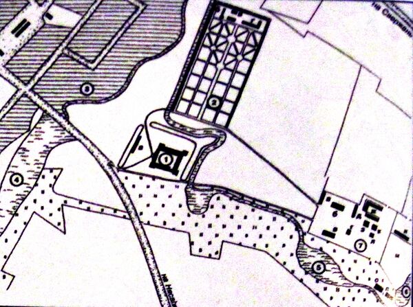 Первые раскопки в Мирском замке осуществил Ю. Иодковкий. Найдя фрагменты цветных стёклышек и полихромных изразцов, он сделал вывод о наличии в замке XVI в. витражей и многоцветных изразцовых печей[194]. Около дворца с севера на юг была выкопана траншея, но остатков построек не нашли. Около главной брамы был найден колодец[195].