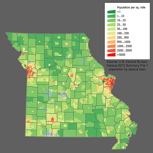 По оценке Бюро переписи населения США население штата Миссури по состоянию на 1 июля 2012 года составляет 6 021 988 человек, что на 0,6 % больше по сравнению с переписью населения США 2010 года[12]. Более половины жителей штата (3 294 936 человек, или 55,0 %) сконцентрирована в агломерациях двух крупнейших городов штата — Сент-Луиса и Канзас-Сити. Плотность населения — 86,9 в 2009 году (практически равна средней в США — 86,8 в 2009 году).