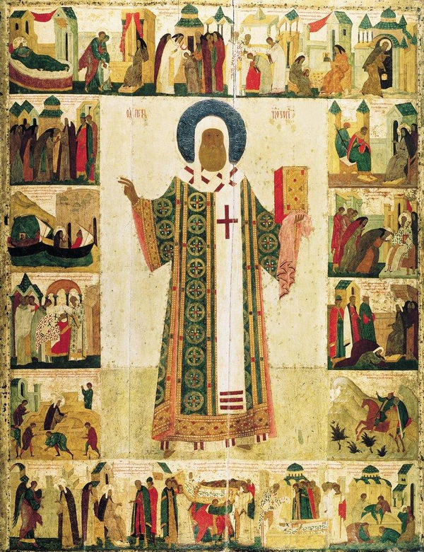 По византийскому образцу, русские житийные иконы объединяли образ святого, который обыкновенно изображался на среднике, и клейма с эпизодами из его жизни. Митрополит Пётр предстаёт «как идеальный русский первосвященник», чудотворец, один из создателей Московского государства[8].