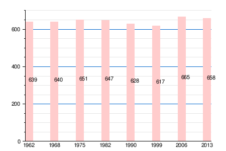 | 639 | 640 | 651 | 647 | 628 | 617 | 665[7][8] | 667 | 655[9] | 660[10] | 658 |