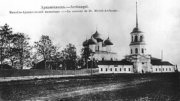 Самым древним храмом дореволюционного Архангельска был Михаило-Архангельский собор Михаило-Архангельского монастыря, сооружённый в 1685—1689 годы по благословению архиепископа Афанасия на месте деревянного храма. Он имел много общего с уцелевшими соборами в Холмогорах (см. Холмогорский собор) и Северодвинске (см. Николо-Корельский монастырь). В 1584 году у стен монастыря был основан город Архангельск.