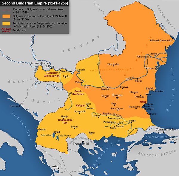В 1246 году Иоанн III Дука Ватац, никейский император, решил воспользоваться малолетством Михаила Асеня и напал на болгарские земли. Ему удалось захватить крупные города Вельбажд, Мелник, Скопье, Сяр, Бат и ряд других. По положениям заключенного в Тырново в 1247 году мира Болгария потеряла около трети своей территории. Одновременно венгры захватили болгарские земли близ Белграда и Браничево, после чего венгерский правитель добавил к своему титулу формулировку «Король Болгарии.»