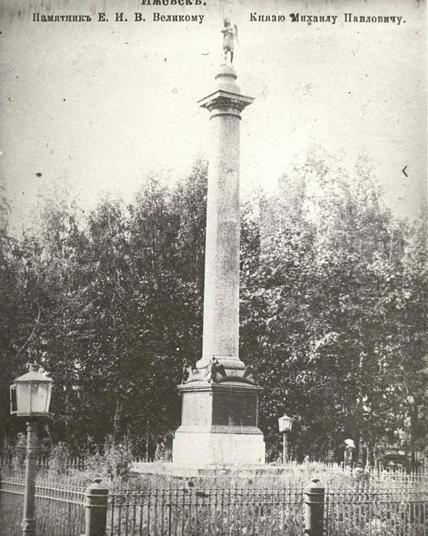 Михайловская колонна была установлена в Ижевске на Базарной площади (позднее стала называться Соборной) и открыта 8 ноября в 1852 г.[2] по повелению императора Николая I. Она была поставлена в честь великого князя Михаила Павловича, скончавшегося тремя годами ранее в 1849 г. Михаил Павлович являлся августейшим начальником военной промышленности Российской Империи в целом и шефом Ижевского оружейного завода в частности. Колонна была выполнена из чугуна, на вершине которой поставили бронзового ангела (ангела Ижевска) с крестом в руках[3][1]. Надпись на пьедестале колонны гласила: