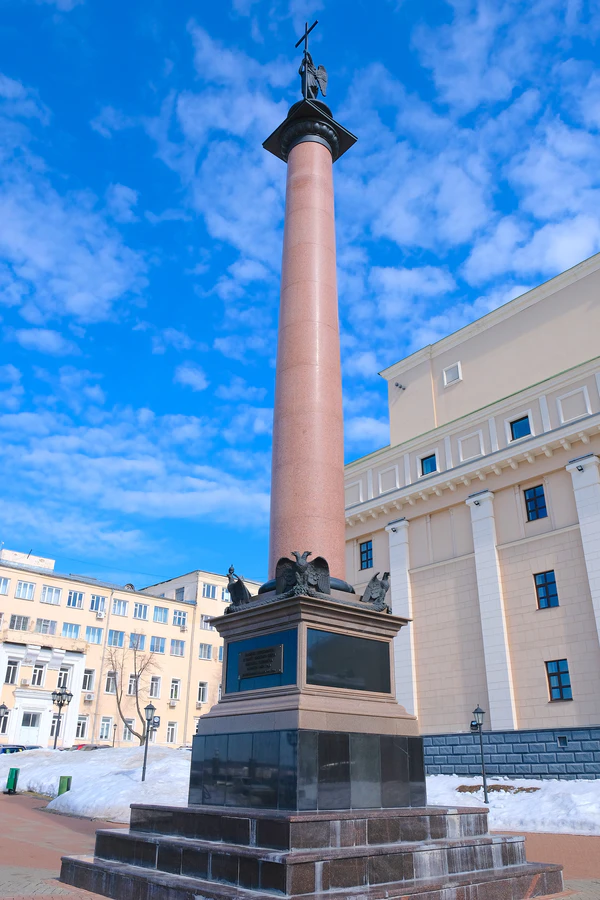 Возведение колонны финансировалось чинами и мастеровыми Ижевского оружейного завода, а её проект был разработан архитекторами завода, руководство которыми осуществлял главный архитектор И. Т. Коковихин. Колонна повторяла собой Александровскую колонну, возведённую в 1834 г. в Санкт-Петербурге.