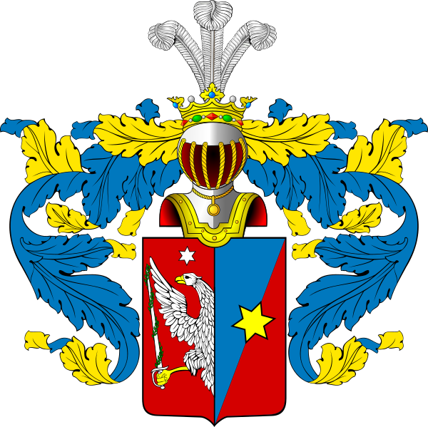 Описание герба: Выписка из Гербовника Щит разделён перпендикулярно на две части, из них в первой в красном поле виден до половины вылетающий белый орёл с распростёртым крылом, держащий в лапе серебряную шпагу, обвитую лаврами, и над орлом серебряная шестиугольная звезда. В левой части разделённой диагонально к правому нижнему углу на два поля: голубое и красное, изображена шестиугольная золотая звезда. Щит увенчан дворянскими шлемом и короной. Нашлемник: три страусовых пера. Намёт на щите голубой, подложенный золотом. Герб рода Михалковых внесён в Часть 5 Общего гербовника дворянских родов Всероссийской империи, стр. 64. |
