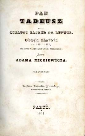 Крупнейшее произведение Мицкевича — эпическая поэма «Пан Тадеуш» («Pan Tadeusz czyli Ostatni zajazd na Litwie»), писавшаяся в 1832—1834 годах и изданная в Париже в 1834 году. В поэме создан полный ностальгии и юмора образ красочных, но исторически обречённых шляхетских нравов[29]. Считается польской национальной эпопеей и шедевром словесной живописи. «Пан Тадеуш» экранизирован польским режиссёром Анджеем Вайдой (1999).