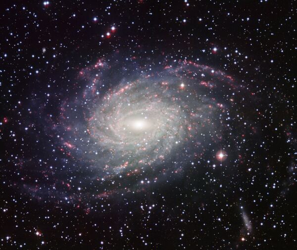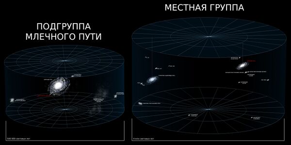 Наша Галактика с её более чем двумя десятками галактик-спутников образует в Местной группе подгруппу Млечного Пути[110], размер которой составляет 300 килопарсеков. Самые крупные и наиболее известные спутники — Большое и Малое Магеллановы Облака, в них идёт звездообразование и присутствуют яркие молодые звёзды. Остальные спутники — карликовые сфероидальные галактики, где звездообразование не идёт. Они получают названия по созвездию, в котором наблюдаются, например, галактика Печь, галактика Скульптор и галактика Насос[108].