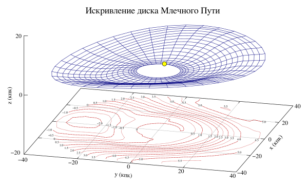 Распределение плотности вещества в зависимости от расстояния до центра в тонком диске Млечного Пути, как и в других галактиках, экспоненциальное, его характерный радиус составляет 3 килопарсека. Тонкий диск простирается до 16 килопарсеков от центра Галактики, а газовая составляющая простирается дальше и прослеживается вплоть до 35 килопарсеков от центра. Диск имеет искривлённую форму во внешних областях, вероятно, из-за взаимодействия с другими галактиками[40][41].