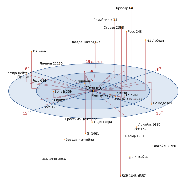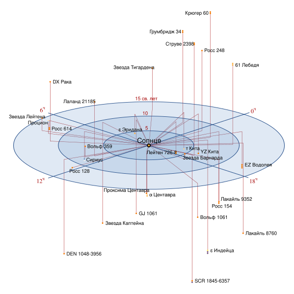 Наиболее изученная область Галактики — окрестность Солнечной системы. Например, в пределах 10 парсеков от Солнца известно 373 звезды, среди которых 20 белых карликов, 85 коричневых карликов, большинство — красных карликов[48]. Расстояние от Солнца до ближайшей звезды — Проксимы Центавра — составляет 1,3 парсека, до ближайшего звёздного скопления — Гиад — 40 парсеков[49].