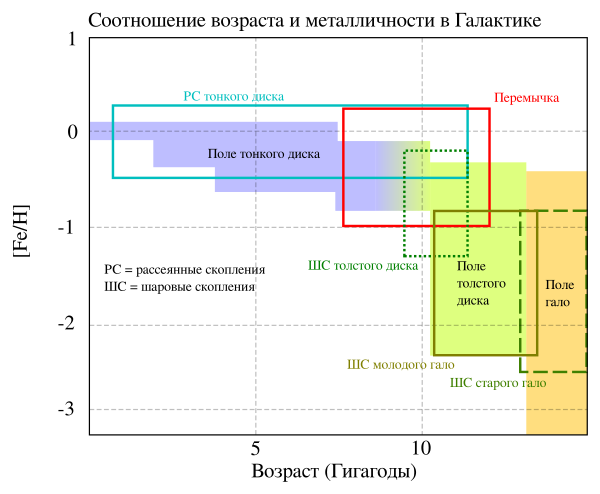 Шаровые скопления в Млечном Пути ― старые объекты, возрасты которых составляют 11―13 миллиардов лет, хотя не во всех галактиках это так — во многих встречаются молодые шаровые скопления[84][86]. Эти объекты в основном имеют низкие металличности, вплоть до −2,5, но у некоторых скоплений металличность превышает солнечную[85].