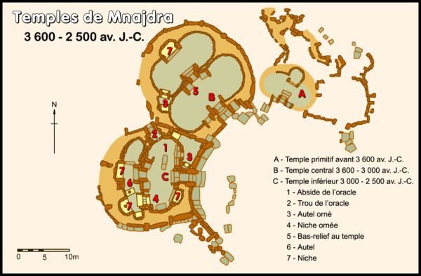 Мнайдра (мальт. Mnajdra) — мегалитический храмовый комплекс, обнаруженный на южном побережье острова Мальта в Средиземном море. Мнайдра расположена примерно в 0,5 км от другого известного мегалитического храма, Хаджар-Ким. Мнайдра сооружена примерно в 4 тысячелетии до н. э. Раскопки храмов в Мнайдре проводились под руководством Дж. Вэнса в 1840 г., всего через год после открытия Хаджар-Кима[2]. В 1871 году Джеймс Фергюссон составил первый план сооружений в Мнайдре, который содержал большое количество ошибок. В 1901 году д-р Альберт Майр составил первый точный план, основанный на его собственных исследованиях[3]. В 1910 году д-р Томас Эшби провёл дополнительные раскопки и собрал важные артефакты. При раскопках в 1949 году были обнаружены две небольшие статуи, две большие чаши, орудия и один большой круглый камень, который, вероятно, использовался для перемещения блоков храма[3].